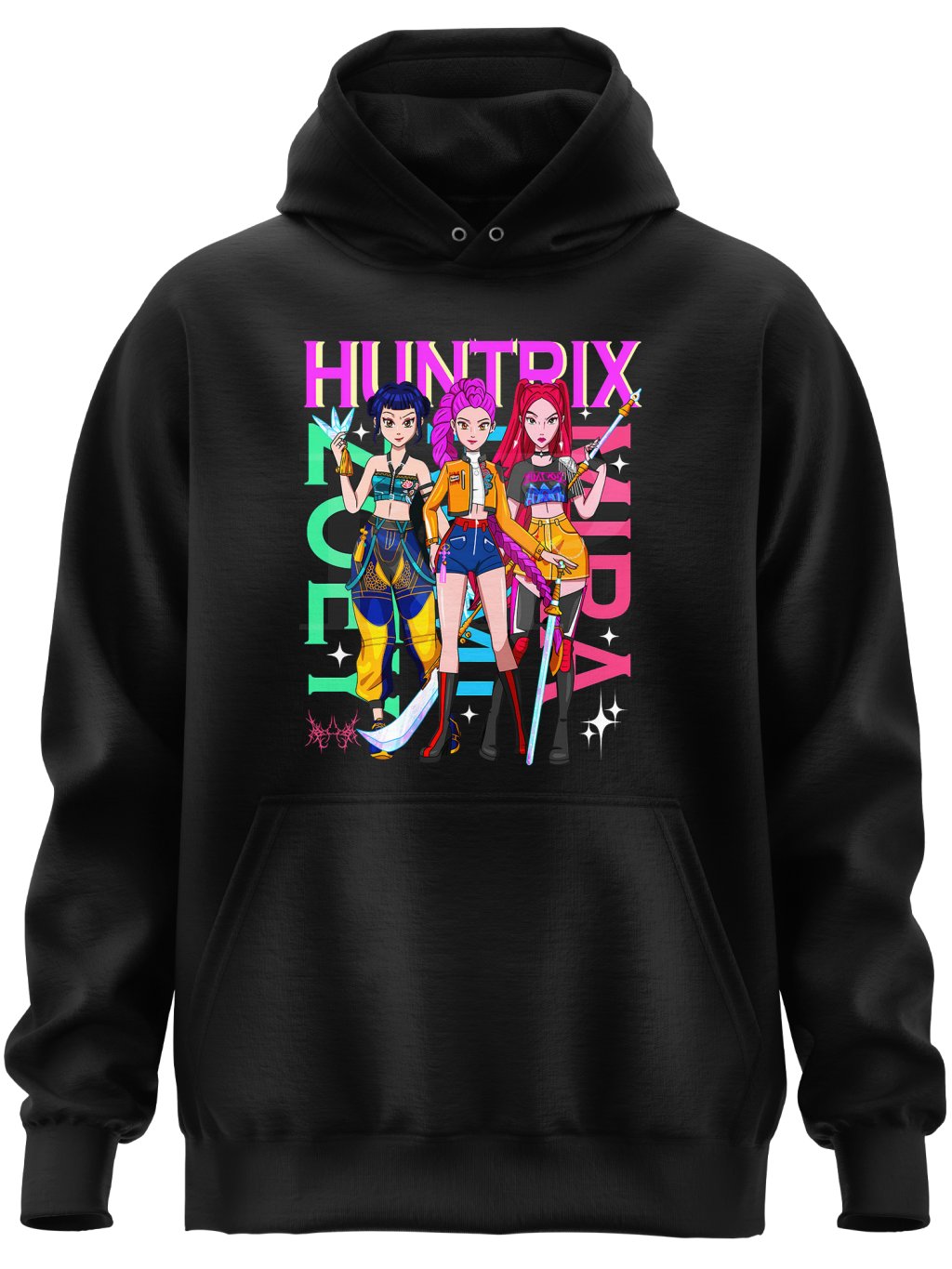 Mikina Huntrix Trio spojuje tři hlavní členky K-Pop Demon Hunters – Huntrix crew do jednoho epického designu. V plné výzbroji, s typickými pózami a neonovými akcenty vypadají jako připravené vyrazit na stage i do boje zároveň.